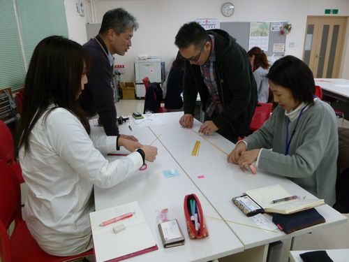 今回はチームごとにパスタ、マスキングテープ、マシュマロを使っ
