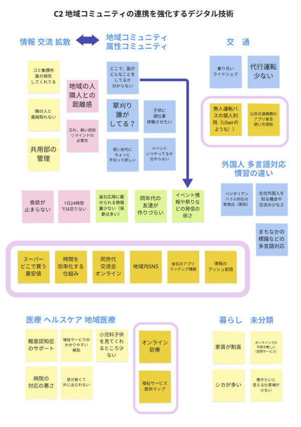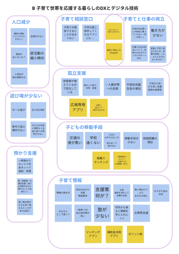 続く「視点共有ワーク」では、住民や行政、事業者が混合チームに分かれ、それぞれの視点から地域課題を洗い出しました。その後、グループ内で共感できる不便や似たような課題を整理し、デジタル技術を活用した解決の可能性を話し合いました。
