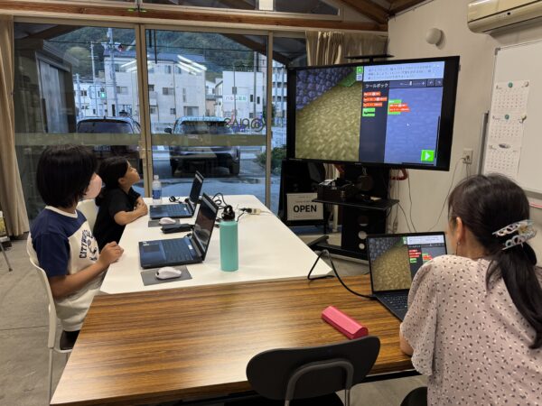 エージェントを命令して動かすプログラミングに挑戦。繰り返しや条件分岐、座標などの概念を学びながら、動かない理由を一緒に考え、何度もテストを繰り返しました。とにかく“苦手意識を持たせない”ように一つずつ丁寧に進めたことで、2人は自然と