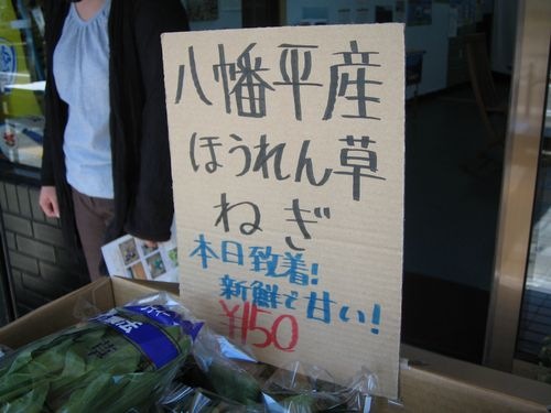 八幡平産のほうれん草とねぎは今朝届いた新鮮なものが並びました。