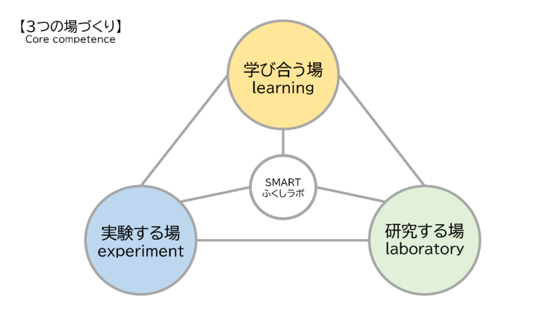 SMARTふくしラボでは現在、学び合う場・研究する場・実験する場といった3つの場を持っている。