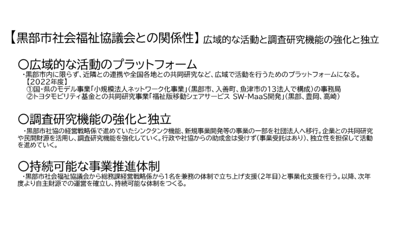 また、企業との連携も含めた他セクターとの協働や民間財源の活用も考えると《独立したプラットフォーム》が必要になることから2022年4月に黒部市社会福祉協議会から派生する形で設立された。