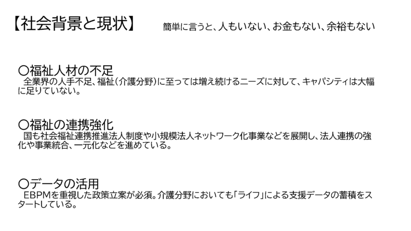 まず始めに、SMARTふくしラボとは何か?なぜ福祉とDXやデジタル化が結びつくのか。というところからお話しが始まります。