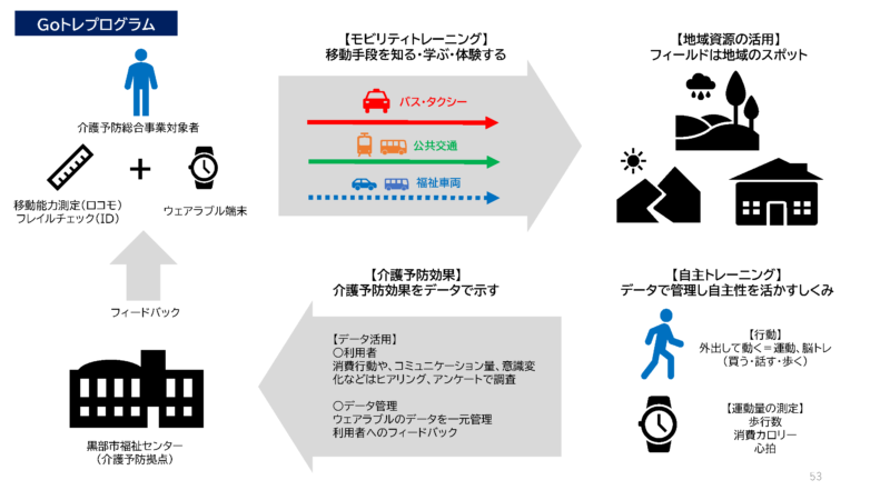 先に述べた送迎のデジタル化(左側)は業務の負担軽減効率化に重点を置いた仕組みですが、ここで考えるGoトレ(右側)は地域の資源をフル活用すること、既存の移動サービス事業者と連携すること。加えて、外出移動支援による自主トレプログラムの開発という展開を想定している。