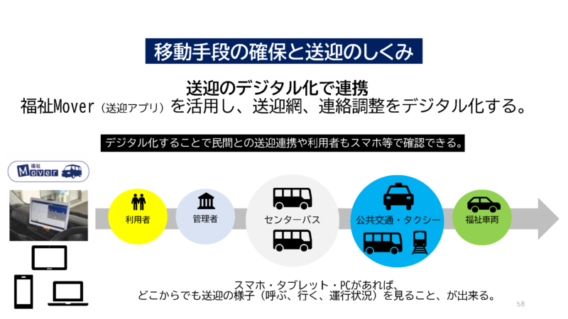 さらに、デジタル(送迎アプリ)を活用することで民間との送迎連携を可能とし、利用者も送迎の様子をスマホ等で確認する事が出来るようになる。