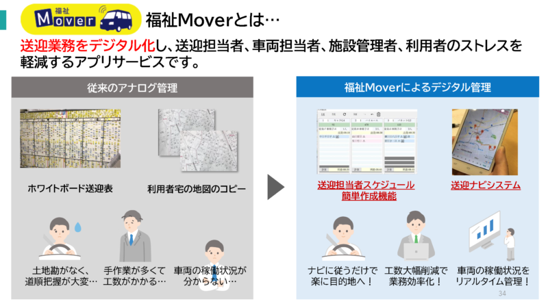 現状、アナログで管理されている送迎業務をデジタル化することで業務が大幅に効率化できる。