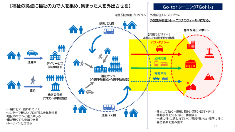左側は福祉拠点への人の動き。右側は福祉センターなどの拠点から人を連れ出す《Goトレ》の仕組み。