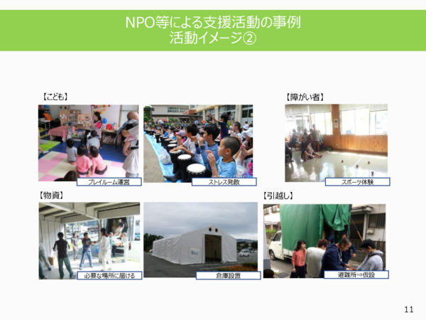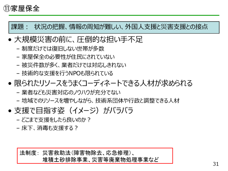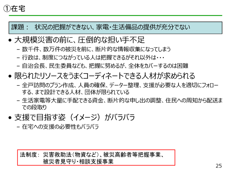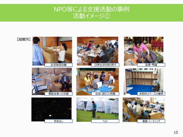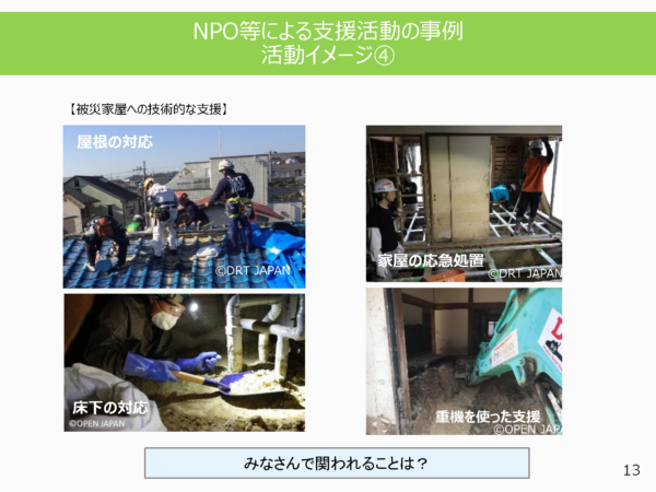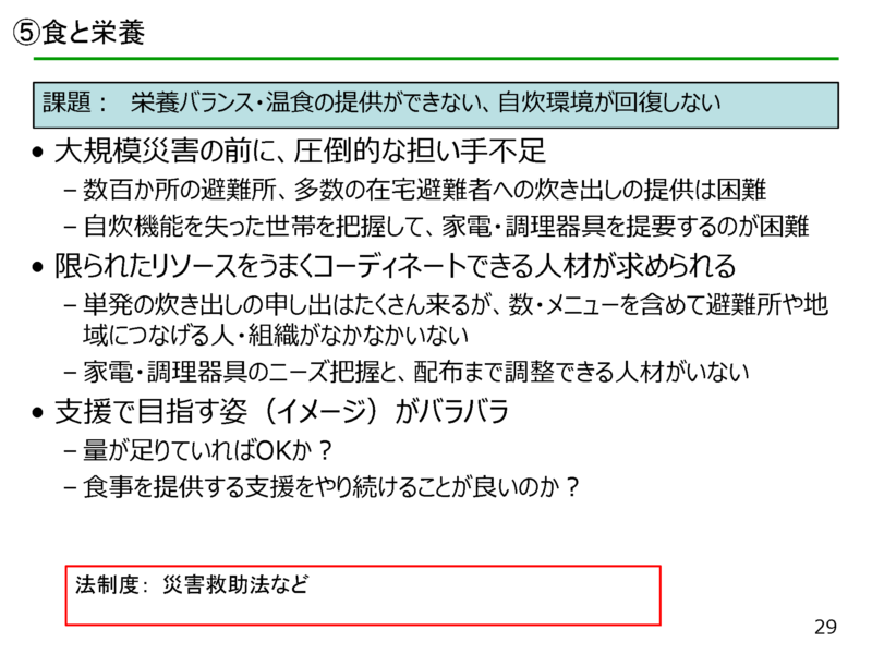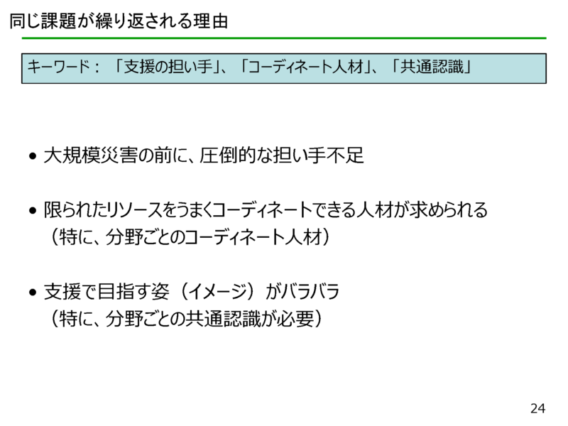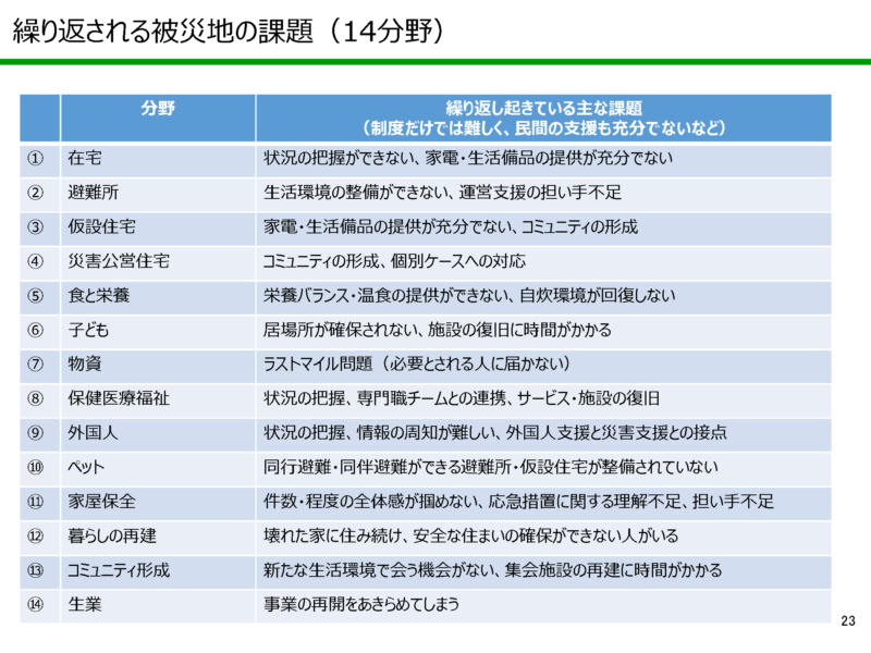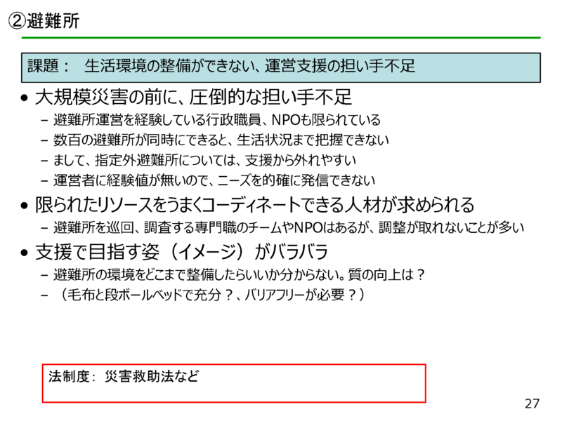 前半では「三者連携」や「制度支援と民間支援」などのお話を頂きましたが、もちろんそれが今後発生するであろう災害に対応できる仕組みというわけではありません。