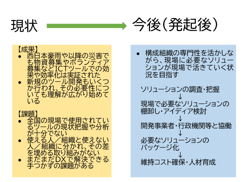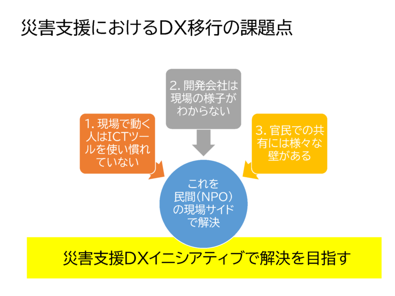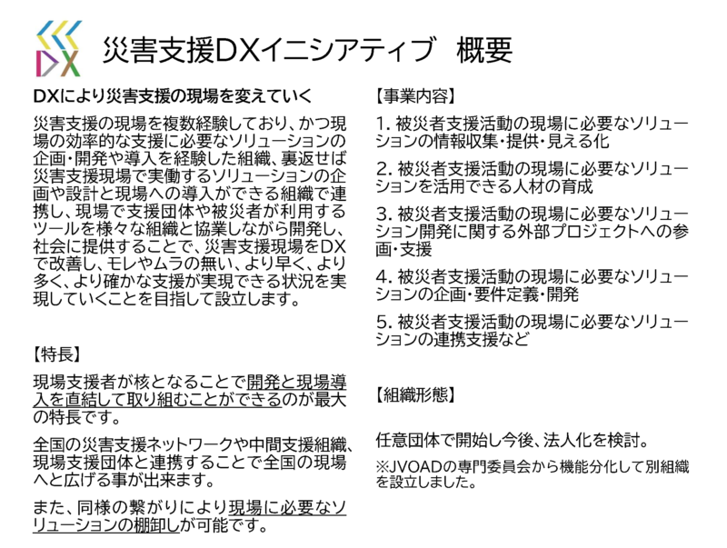 では、そうした課題を解決するための方法を少しでも広げていく。そうした思いが今回紹介する「災害支援DXイニシアチブ」です。