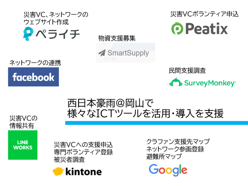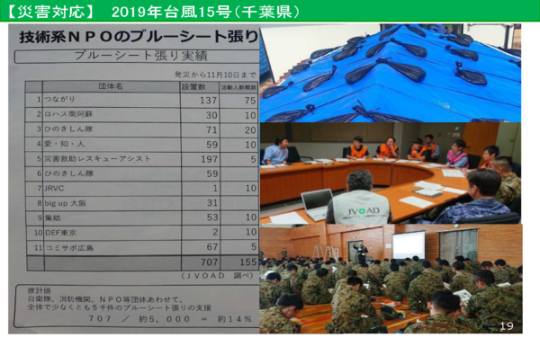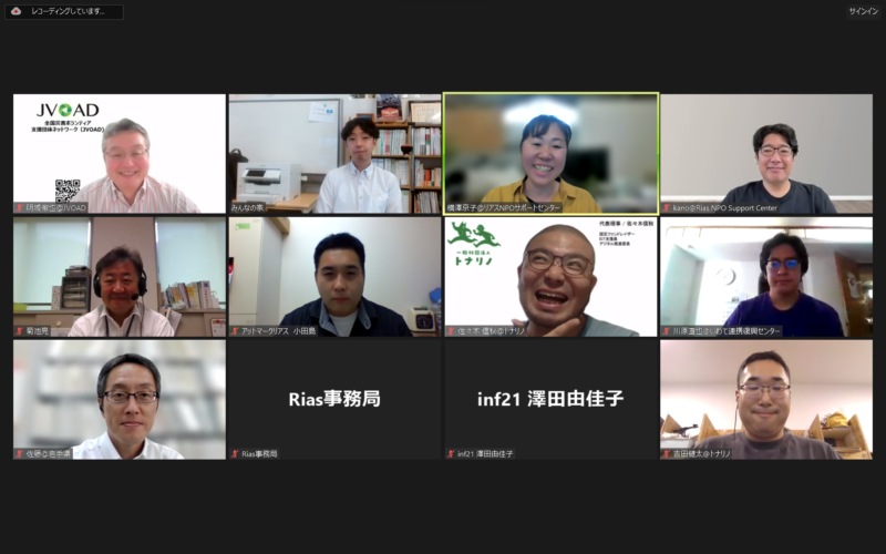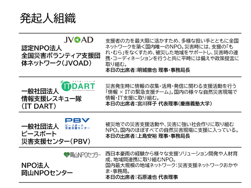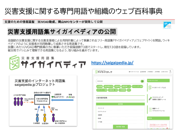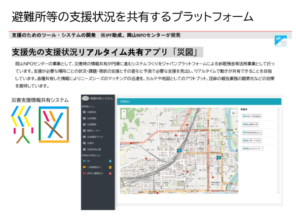 続いて、発起会メンバーでもある岡山NPOセンターが2018年の西日本豪雨の時に開発・活用した災害支援のシステムの一例を引き合いに、ツールをベースに今後の災害発生時に活用できるようにしていくこと検討しているとのお話もありました。