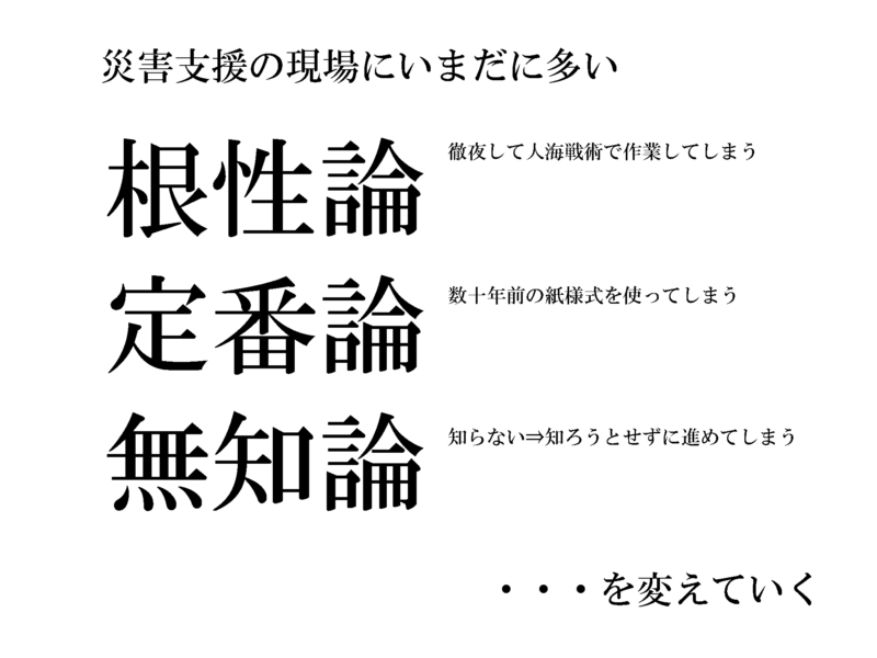 そう考えると、災害支援は「やるべき事」だけを並べても解決しない事に気づかされます。
