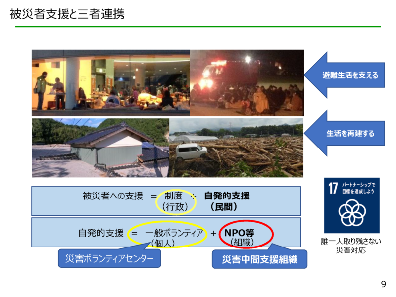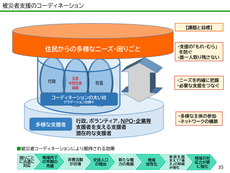 これまでのお話から「三者連携」の具体的な形として「災害中間支援組織」を含めた被災者支援のコーディネーションが重要であることは考えられます。