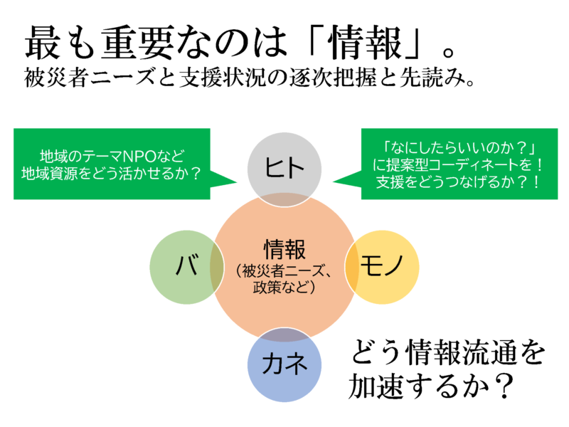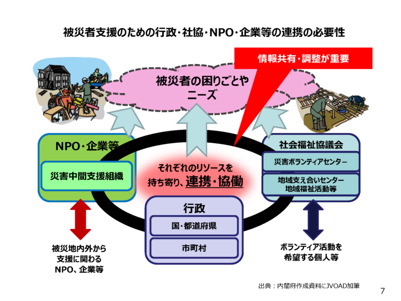 「被災者支援」のために「NPO・企業等」・「社会福祉協議会」・「行政」が、それぞれのリソースを持ち寄って十分な情報共有と調整をベースに連携し協働で必要な支援を行う。事が重要になります。