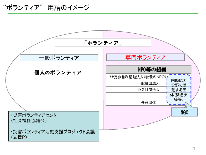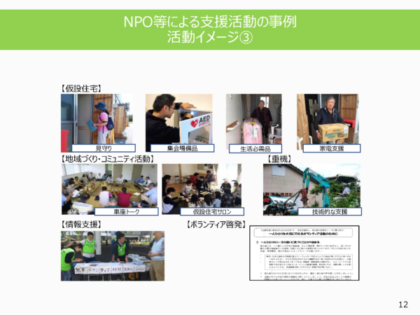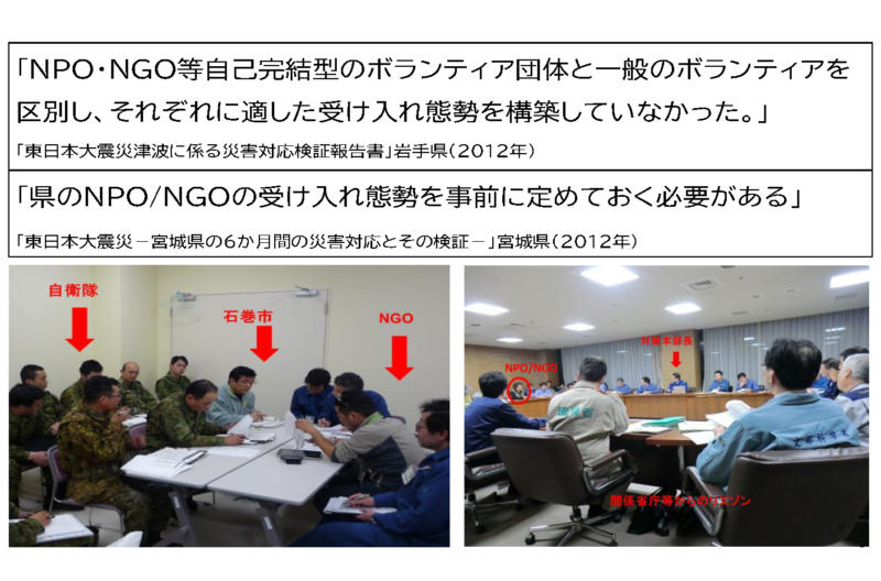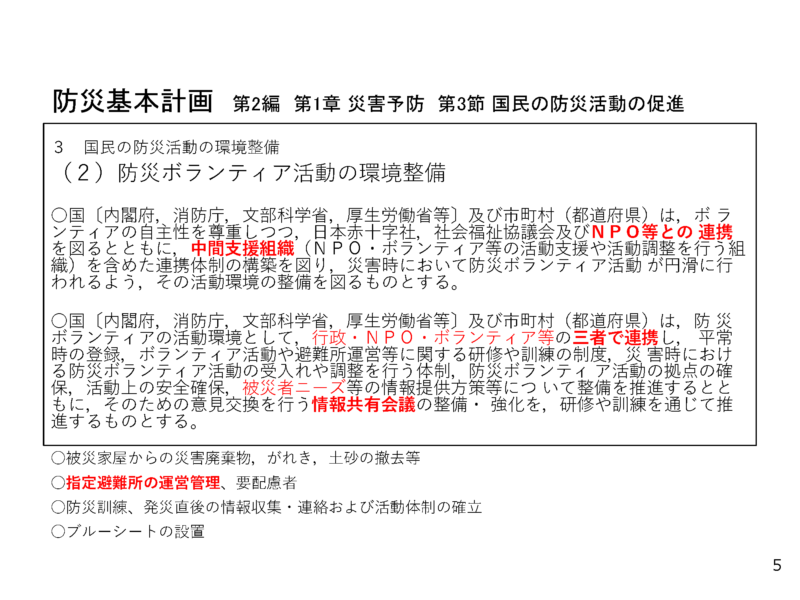 東日本大震災以後、これらの事を踏まえて国の防災基本計画にも「行政・NPO・ボランティア等の三者で連携」すべきと明記されており、年を追うごとに具体的な連携体制の強化に関する文言が追加されています。