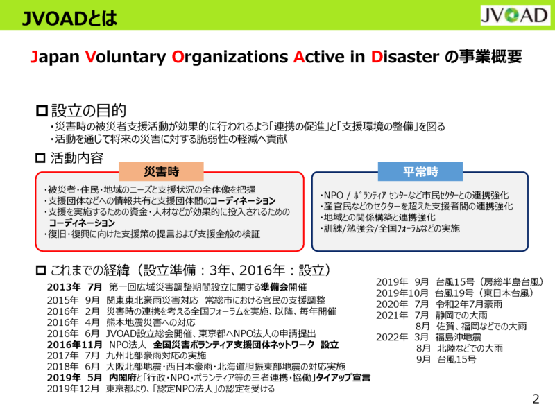 JVOADは、2016年に設立されたNPO法人で、災害時の被災者支援活動が効果的に行われるよう「連携の促進」と「支援環境の整備」を図る事を目的にしています。