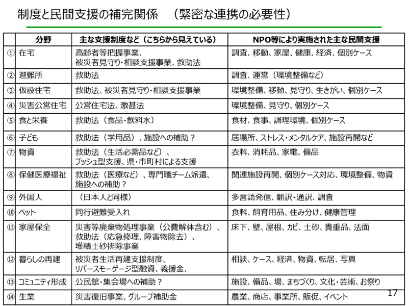 これら被災者支援については行政が制度で行う事と、民間が自発的に行うことを複合的に考える必要があるとのこと。