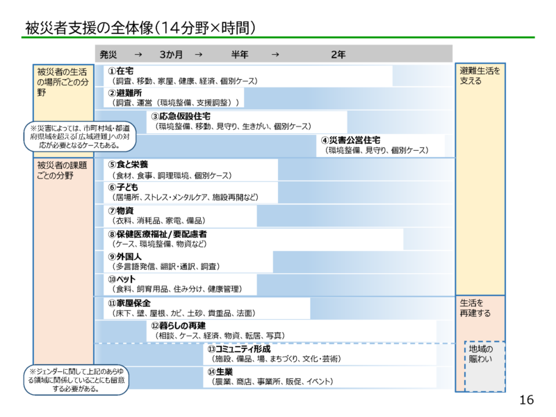 三者連携を有効なモノとするためには支援側の出来ること、被災者に必要と思われる支援の全体像を俯瞰する必要がある事からいくつかの視点でそれらをまとめたのがこれらの図となります。