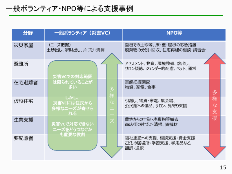 個々のボランティアについて少し整理をすると、個人のボランティアについては災害ボランティアセンターといった受入体制はあったが、図の右側にある「自発的に組織として支援活動を行う」ボランティアについての受入や調整を行う仕組みが無かったと言うことです。
