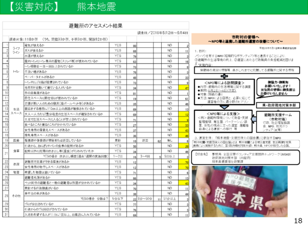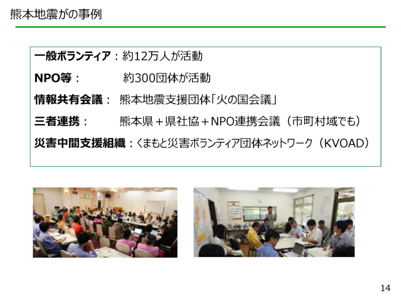 災害中間支援組織が有効に機能した例として、熊本地震事例が挙げられた。