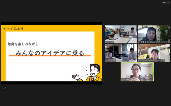 後半は今年度、地域課題解決のアイデアを探るワークショップを開催する上で、コーディネーター兼ファシリテーターをお願いした「一般社団法人 妄想からアイデアを共創する協会」の相内洋輔さんにオンラインでご参加いただきワークショップを行いました。今年度「釜石市におけるデジタルを活用した防災のための仕組み作りとコミュニティサポート事業」で行うワークショップは妄想アイデアトレーニング「モウトレ」という手法で活用します。第1回目の本日は「モウトレ」によるワークショップの体験的な意味も含め、時間を短縮して実施していただきました。
