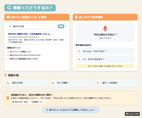 今回は「スマホの基本操作」「文字入力」「音量設定」「ネット検索に挑戦」「よくある困りごと」などを扱いました。講師によるデモンストレーションのあと、参加者が自分のスマホで実際に操作するスタイルで進行。配布したオリジナルテキストを見ながら、一つ一つ確認しながら練習しました。